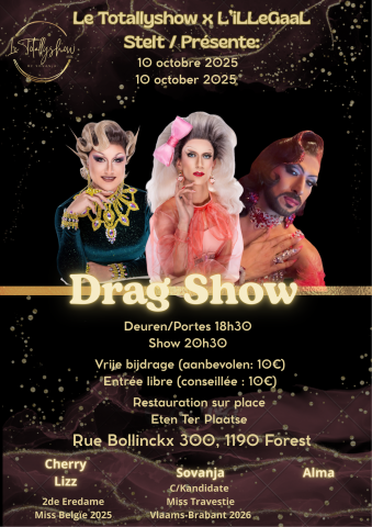 Prépare-toi pour une soirée drag 100% belge pleine de paillettes et d’émotions ! Sur scène : Cherry Lizz (2e Dauphine Miss Travestie Belgique 2025), Alma (la fabuleuse liégeoise) & Sovanja (candidate Miss Travestie Vlaams Brabant 2026).