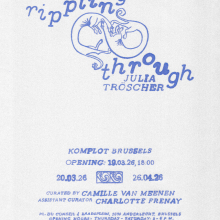 Komplot, Bruxelles, présente rippling through, une exposition duo des artistes Natalija Gucheva (basée à Gand) et Julia Tröscher (basée à Anvers), qui ouvrira le 19 mars 2026. À travers la vidéo et l’installation, elles explorent la mémoire, l’émotion et les formes de communication subconscientes, mêlant expérience personnelle et réflexion collective dans des œuvres immersives et méditatives.