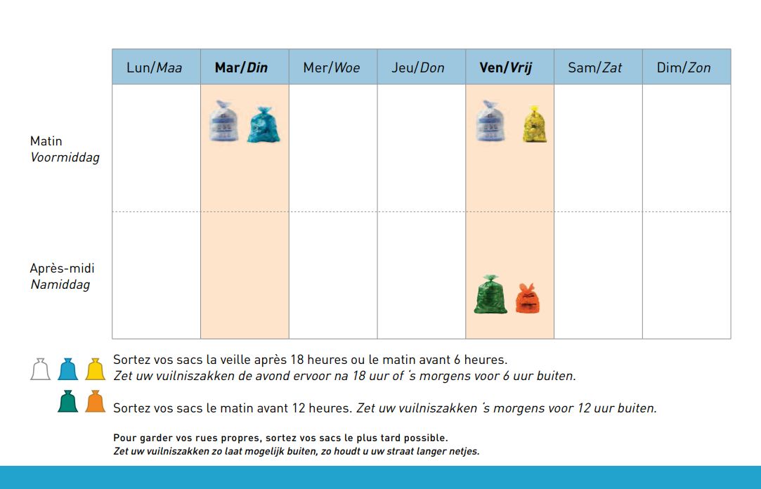 Opgelet : Het naleven van de uren voor ophaling van de vuilniszakken is een verplichting. Doe je dit niet, dan kun je een boete krijgen op basis van het “Gemeentelijke belasting voor de reiniging van de openbare ruimte” of een administratieve sanctie op basis van artikel 28§1 van het Algemeen Politiereglement.
